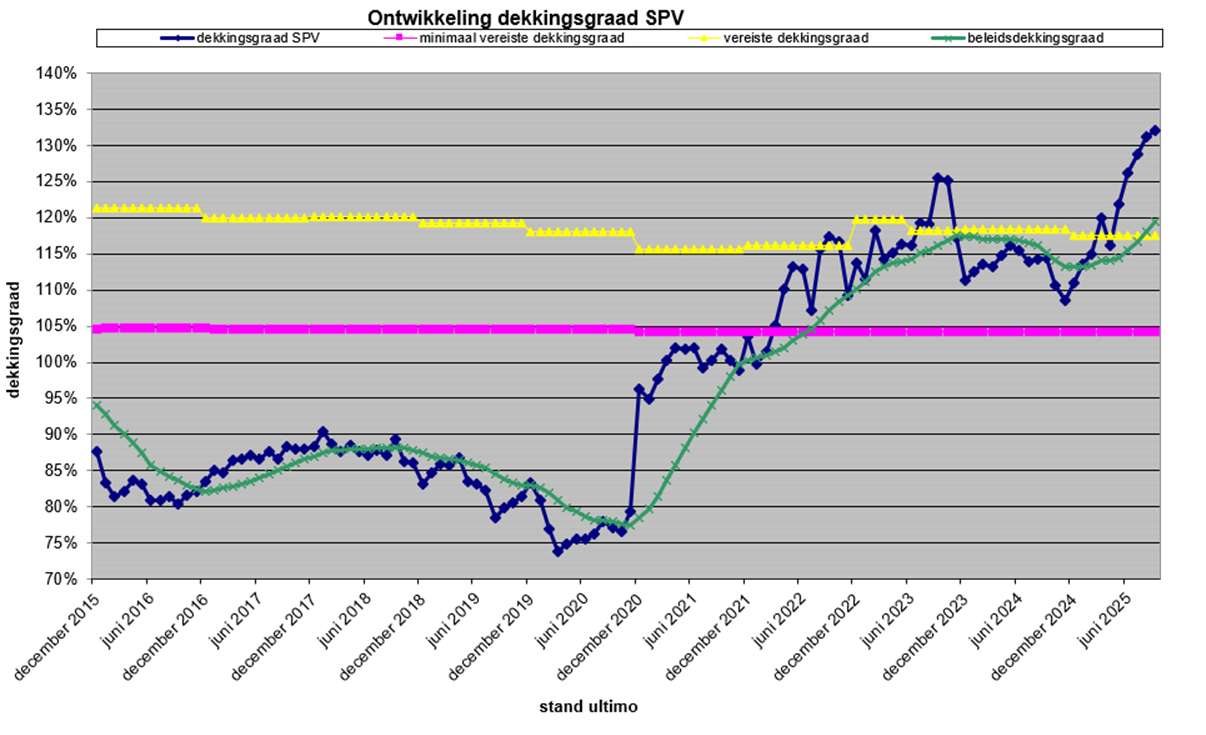 De beleidsdekkingsgraad geeft aan hoe financieel gezond we zijn. De (actuele) dekkingsgraad is de verhouding tussen ons vermogen nu en de pensioenen die we nu en in de toekomst moeten uitbetalen. Maandelijks rapporteert SPV de beleidsdekkingsgraad aan DNB. De beleidsdekkingsgraad is het gemiddelde van de actuele dekkingsgraden in de afgelopen 12 maanden. De beleidsdekkingsgraad moet voldoende hoog zijn. Is de beleidsdekkingsgraad bijvoorbeeld 110%? Dan staat tegenover elke € 100,- die het fonds moet uitbetalen, € 110,- aan vermogen.