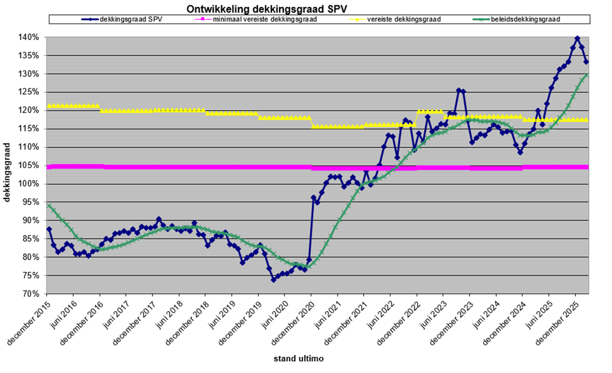 De beleidsdekkingsgraad geeft aan hoe financieel gezond we zijn. De (actuele) dekkingsgraad is de verhouding tussen ons vermogen nu en de pensioenen die we nu en in de toekomst moeten uitbetalen. Maandelijks rapporteert SPV de beleidsdekkingsgraad aan DNB. De beleidsdekkingsgraad is het gemiddelde van de actuele dekkingsgraden in de afgelopen 12 maanden. De beleidsdekkingsgraad moet voldoende hoog zijn. Is de beleidsdekkingsgraad bijvoorbeeld 110%? Dan staat tegenover elke € 100,- die het fonds moet uitbetalen, € 110,- aan vermogen.